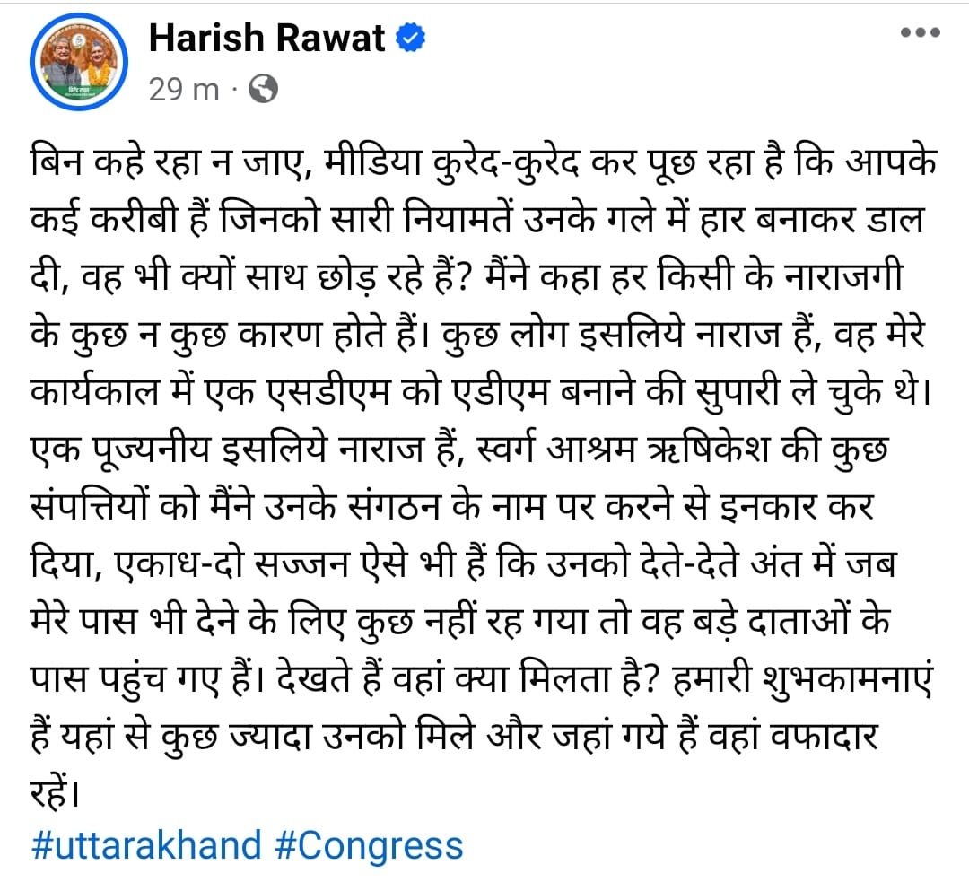 अपने करीबी नेताओं के बीजेपी में शामिल होने को लेकर हरीश रावत ने कहा है बिन कहे रहा न जाए, मीडिया कुरेद-कुरेद कर पूछ रहा है कि आपके कई करीबी हैं जिनको सारी नियामतें उनके गले में हार बनाकर डाल दी, वह भी क्यों साथ छोड़ रहे हैं? मैंने कहा हर किसी के नाराजगी के कुछ न कुछ कारण होते हैं।