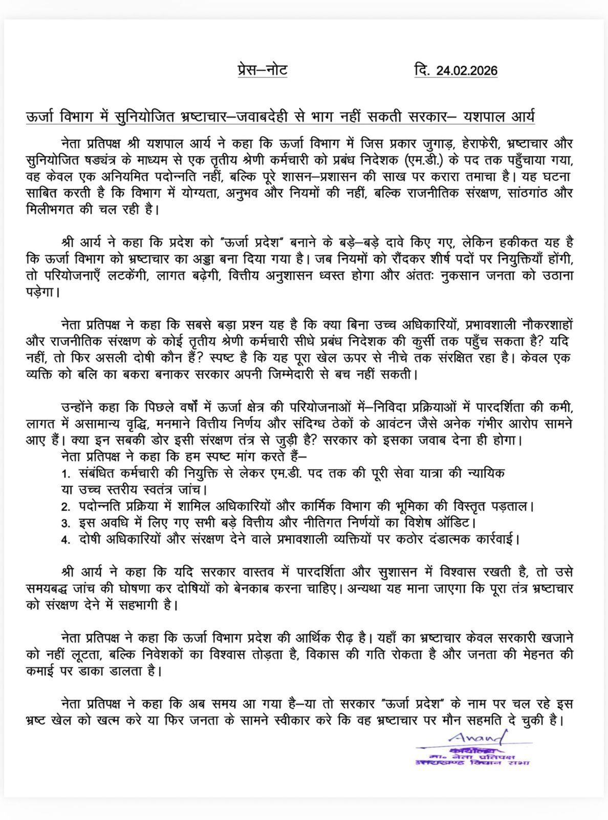 नेता प्रतिपक्ष यशपाल आर्य ने कहा कि ऊर्जा विभाग में जिस प्रकार जुगाड़, हेराफेरी, भ्रष्टाचार और सुनियोजित षड्यंत्र के माध्यम से एक तृतीय श्रेणी कर्मचारी को प्रबंध निदेशक (एम.डी.) के पद तक पहुंचाया गया, वो केवल एक अनियमित पदोन्नति नहीं, बल्कि पूरे शासन-प्रशासन की साख पर करारा तमाचा है। यह घटना साबित करती है कि विभाग में योग्यता, अनुभव और नियमों की नहीं, बल्कि राजनीतिक संरक्षण, सांठगांठ और मिलीभगत की चल रही है। आर्य ने कहा कि प्रदेश को “ऊर्जा प्रदेश” बनाने के बड़े-बड़े दावे किए गए, लेकिन हकीकत यह है कि ऊर्जा विभाग को भ्रष्टाचार का अड्डा बना दिया गया है। जब नियमों को रौंदकर शीर्ष पदों पर नियुक्तियाँ होंगी, तो परियोजनाएँ लटकेंगी, लागत बढ़ेगी, वित्तीय अनुशासन ध्वस्त होगा और अंततः नुकसान जनता को उठाना पड़ेगा।