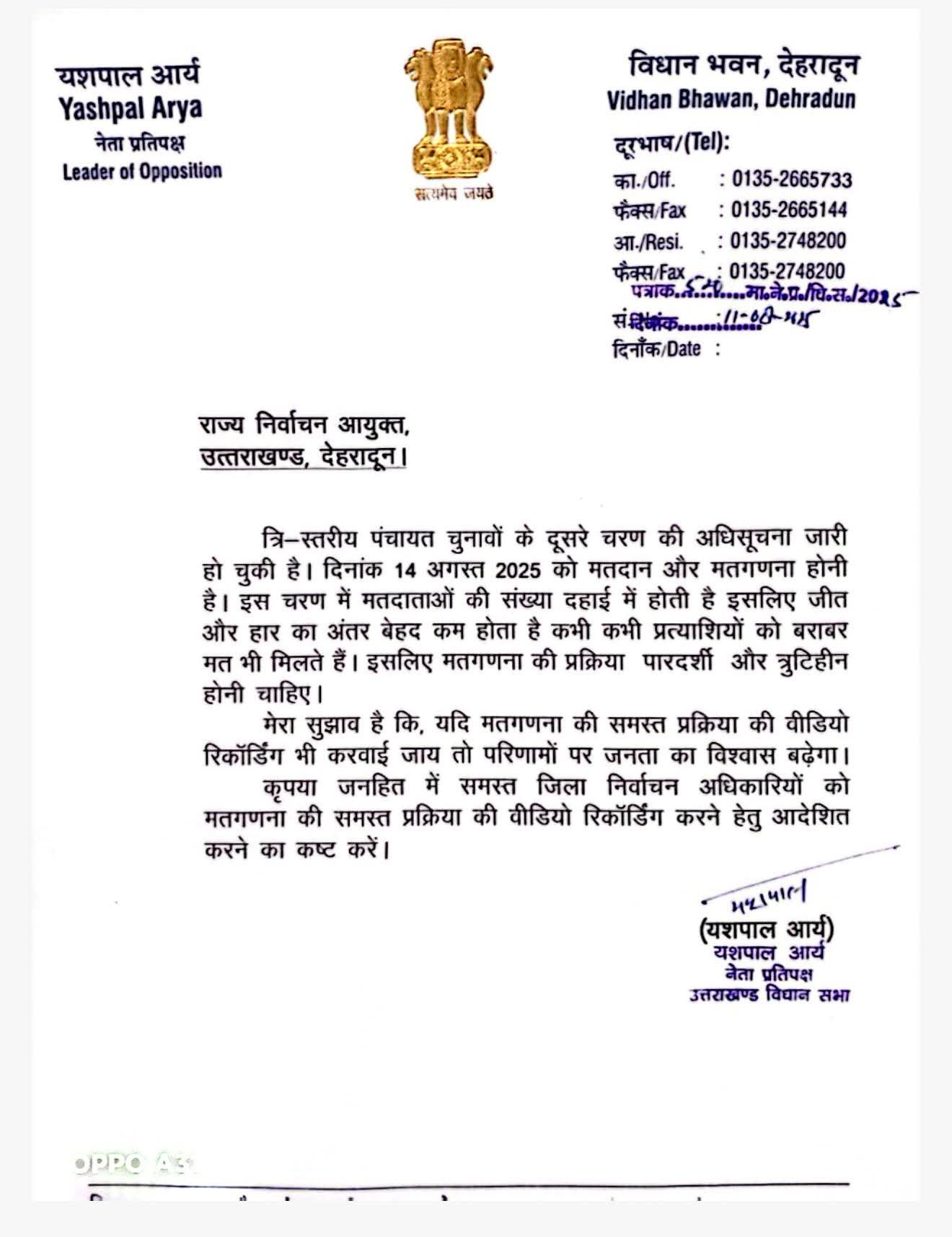 उत्तराखंड में नेता प्रतिपक्ष यशपाल आर्य ने राज्य निर्वाचन आयुक्त को चिट्ठी लिखी है। यशपाल आर्य ने जिला पंचायत अध्यक्ष और ब्लॉक प्रमुख के चुनाव की काउंटिंग सीसीटीवी या ऑन कैमरा करने की मांग की है। यशपाल आर्य ने चिट्ठी में लिखा है