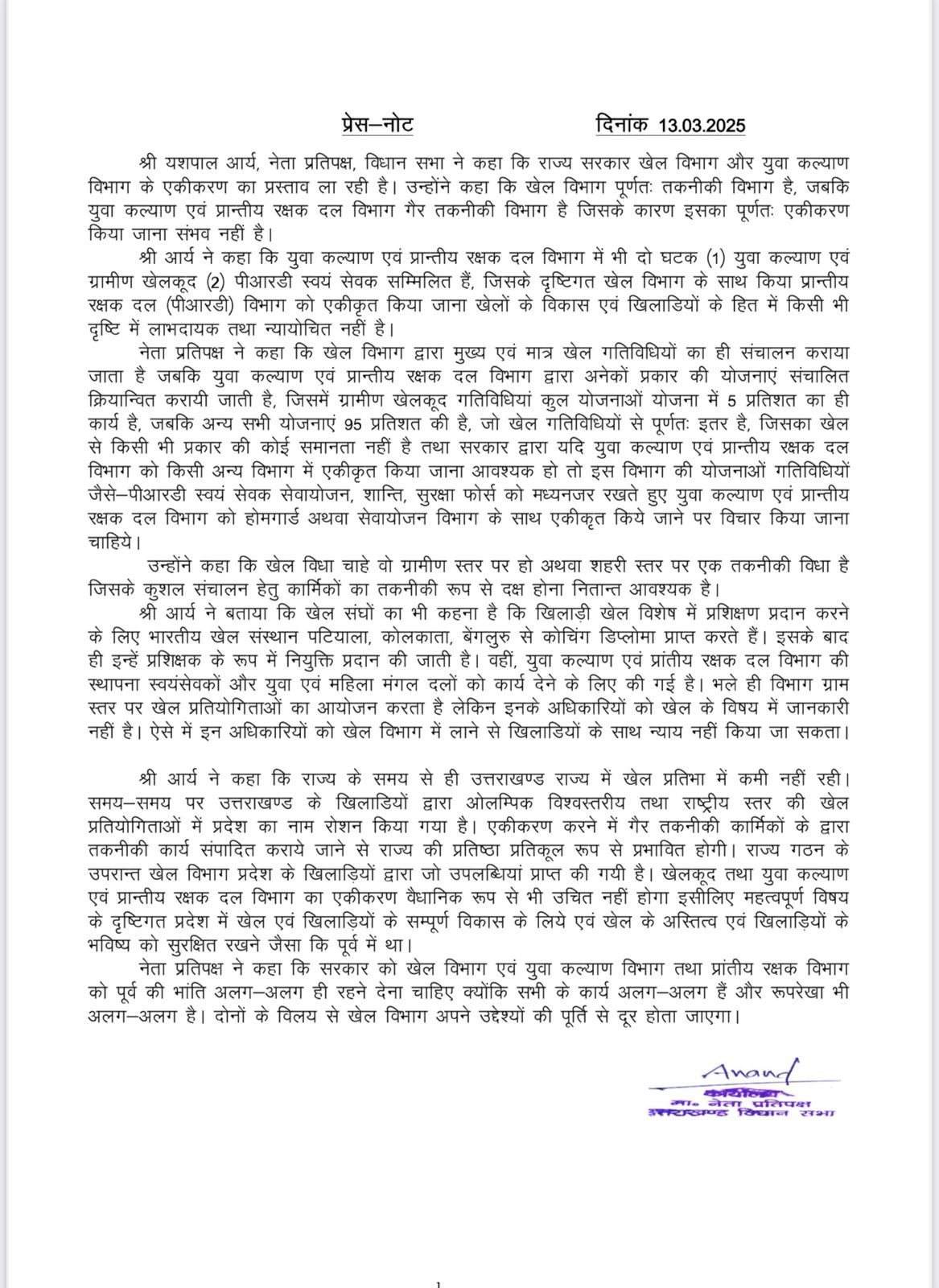 उन्होंने कहा कि खेल विधा चाहे वो ग्रामीण स्तर पर हो अथवा शहरी स्तर पर एक तकनीकी विधा है जिसके कुशल संचालन हेतु कार्मिकों का तकनीकी रूप से दक्ष होना नितान्त आवश्यक है। आर्य ने बताया कि खेल संघों का भी कहना है कि खिलाड़ी खेल विशेष में प्रशिक्षण प्रदान करने के लिए भारतीय खेल संस्थान पटियाला, कोलकाता, बेंगलुरु से कोचिंग डिप्लोमा प्राप्त करते हैं। इसके बाद ही इन्हें प्रशिक्षक के रूप में नियुक्ति प्रदान की जाती है। वहीं, युवा कल्याण एवं प्रांतीय रक्षक दल विभाग की स्थापना स्वयंसेवकों और युवा एवं महिला मंगल दलों को कार्य देने के लिए की गई है। भले ही विभाग ग्राम स्तर पर खेल प्रतियोगिताओं का आयोजन करता है लेकिन इनके अधिकारियों को खेल के विषय में जानकारी नहीं है। ऐसे में इन अधिकारियों को खेल विभाग में लाने से खिलाडियों के साथ न्याय नहीं किया जा सकता। नेता प्रतिपक्ष ने कहा कि राज्य निर्माण के समय से ही उत्तराखण्ड राज्य में खेल प्रतिभा में कमी नहीं रही। समय-समय पर उत्तराखण्ड के खिलाडियों द्वारा ओलम्पिक विश्वस्तरीय तथा राष्ट्रीय स्तर की खेल प्रतियोगिताओं में प्रदेश का नाम रोशन किया गया है। एकीकरण करने में गैर तकनीकी कार्मिकों के द्वारा तकनीकी कार्य संपादित कराये जाने से राज्य की प्रतिष्ठा प्रतिकूल रूप से प्रभावित होगी। राज्य गठन के उपरान्त खेल विभाग प्रदेश के खिलाड़ियों द्वारा जो उपलब्धियां प्राप्त की गयी है। खेलकूद तथा युवा कल्याण एवं प्रान्तीय रक्षक दल विभाग का एकीकरण वैधानिक रूप से भी उचित नहीं होगा इसीलिए महत्वपूर्ण विषय के दृष्टिगत प्रदेश में खेल एवं खिलाड़ियों के सम्पूर्ण विकास के लिये एवं खेल के अस्तित्व एवं खिलाड़ियों के भविष्य को सुरक्षित रखने जैसा कि पूर्व में था।